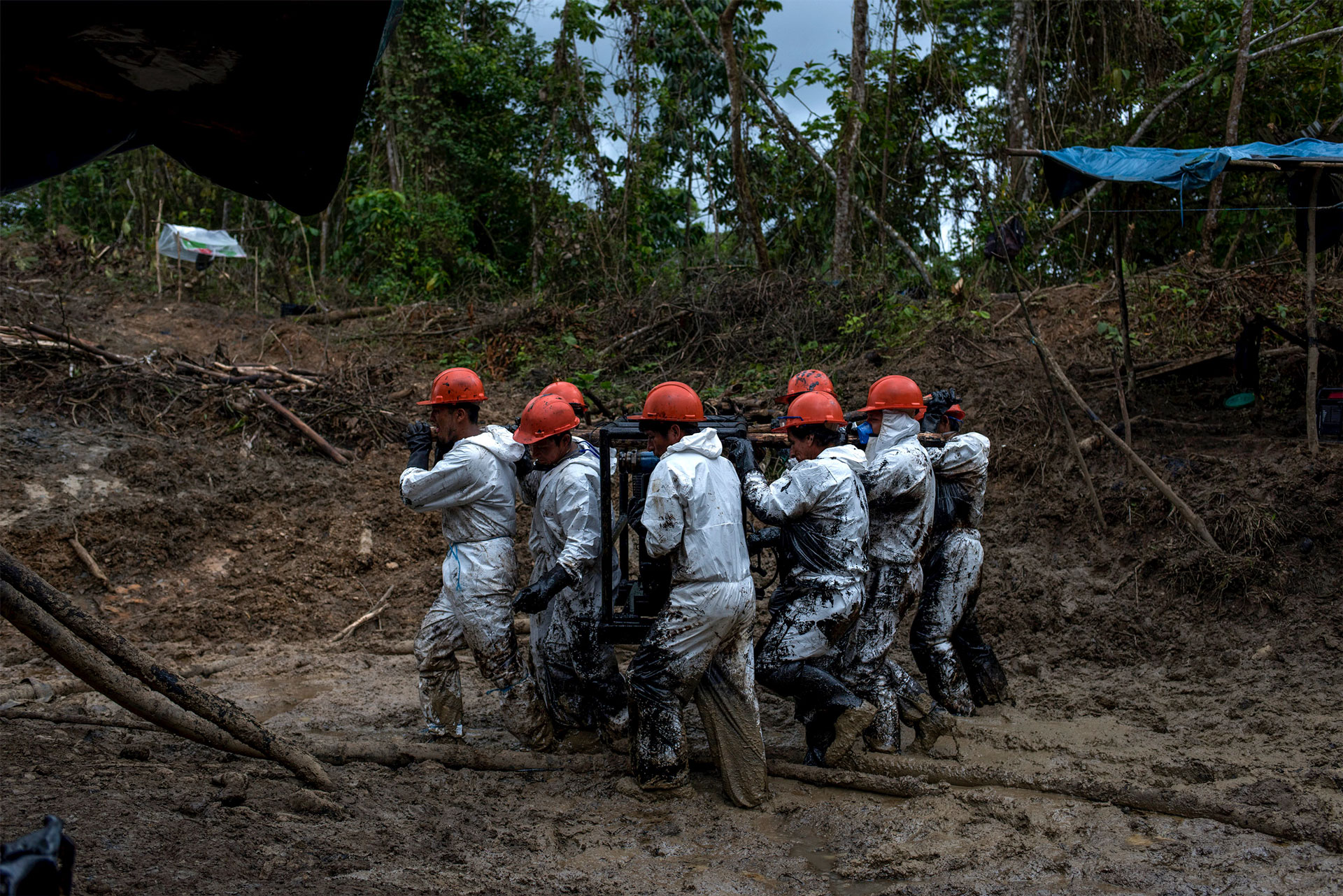 Es agosto, uno de los meses más calurosos en Madre de Dios, en la selva oriental del Perú, y la ingeniera Wendy Pineda intenta protegerse del sol del mediodía cubriendo su cabeza con una hoja ancha como un paraguas. Hay casi cuarenta grados de temperatura y, a pesar de que nos encontramos en una de las regiones con mayor biodiversidad del planeta, no hay un solo árbol alrededor que pueda darnos sombra. La minería ilegal de oro ha depredado esta zona del bosque amazónico hasta convertirlo en un paisaje lunar: lo que antes eran hectáreas con altos aguajales y quebradas, ahora son pampas áridas donde todo lo verde parece haber sido rasurado. No se escucha el gorjeo de las aves ni el aullido de los monos. Solo oímos el ruido de motores viejos que succionan el barro del subsuelo donde se halla el mineral dorado.