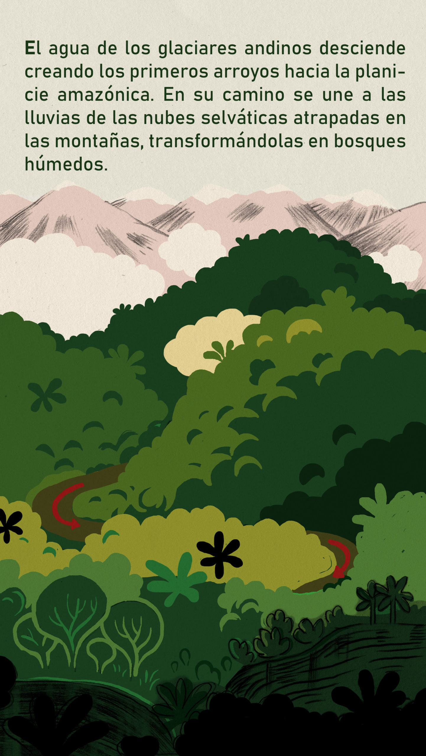 En la Amazonía puedes ver muy claramente el vínculo que hay entre el bosque y el agua. Cuando estamos en la selva, en áreas de bosques inundables, nos damos cuenta de que el agua lo es todo y tiene la capacidad de transformarlo todo. Cuando el río está crecido y se conecta con el bosque, todo se vuelve un solo sistema. Los peces y otros animales acuáticos se meten al bosque y utilizan ese espacio para alimentarse, reproducirse y refugiarse. Es interesante también poder ver y darte cuenta de que el agua no es la misma en todas partes. Hay aguas negras, aguas blancas y zonas donde se mezclan, que es el área donde se concentran los peces para reproducirse y, también, donde van los delfines a alimentarse. Y cuando el río baja su nivel, empiezan a aparecer nuevamente las playas y el bosque que ha sido nutrido por los sedimentos acarreados desde lugares muy lejanos. Estas áreas que van apareciendo son aprovechadas por otros animales para reproducirse, pero también por las personas, para sembrar. Esta relación estrecha entre el agua y el bosque también se da con la gente. Para las comunidades indígenas Kukama Kukamiria, por ejemplo, el río y las lagunas tienen madre, debajo del río viven sus parientes y ambos mundos, el acuático y el terrestre, no se pueden separar. En resumen, todo está conectado.